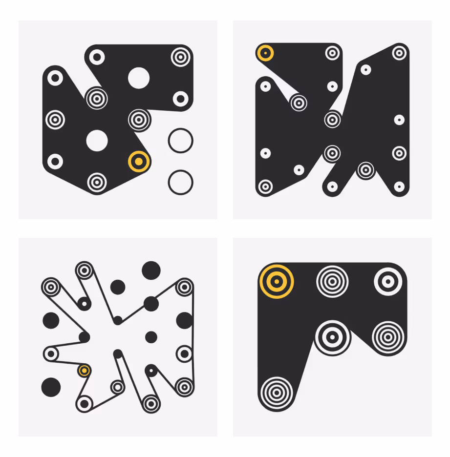 Cherniak’s most celebrated and recognizable body of work to date is his Ringers collection, released on Art Blocks in 2021 as a series of 1,000 unique digital pieces. Ringers recalls the tactile games played by children or the serpentine belts used by engineers. It is executed in a limited palette of black, white, yellow, beige, and — far more rarely — blue, red, and green. Circles (or pegs) of varying sizes anchor the pieces and dictate the movement of lines (or string), which loop around the circles to create both solid forms and negative spaces. Cherniak has articulated that, whereas wrapping string around pegs on one’s hands in the physical world is a very intuitive and natural act, achieving the same visual effect digitally through code is complicated and “unnatural.” Nonetheless, the result appears familiar and organic.