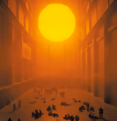Intermediality has been a popular tool in ecological art for decades. In 1970, for example, the American sculptor Robert Smithson created his seminal earthwork sculpture Spiral Jetty in Utah (figure 6). Spiral Jetty is an immersive, living sculpture that constantly evolves due to environmental conditions: season, weather, water level, human intervention, and the effects on each of these by climate change. Over thirty years later, in 2003, the Danish-Icelandic artist Olafur Eliasson created his immersive The Weather Project at Tate Modern in London (figure 7). Using light and water, amplified by visual illusions, Eliasson simulated a glowing sun and heavy mist within the Tate Modern lobby. By recreating the tactile experience of the outside weather inside the museum, he brought the environment to the fore of the viewer’s attention. Anadol builds upon this ongoing artistic tradition in ecological art, uniting it with the cultural heritage of the Yawanawá people and the technology of the 21st century to create something entirely new: a radical call for sustainability.