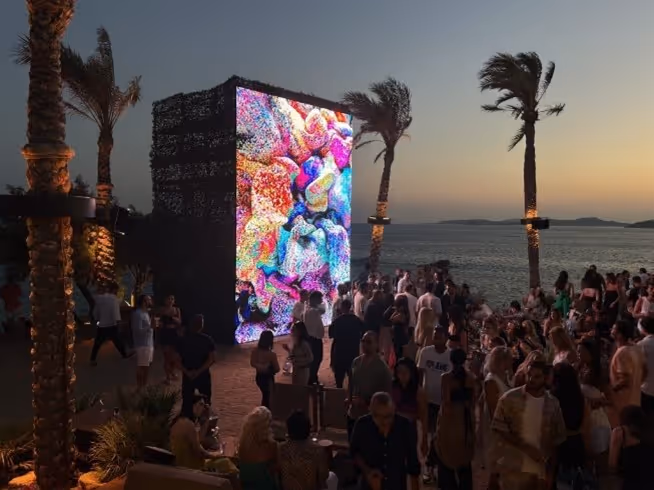 In addition to the 1,000 data paintings, Anadol produced three large-scale data sculptures as part of his Winds of Yawanawá project. These data sculptures are 8-minute loops and can be experienced in a more collective and immersive manner than the data paintings. In July 2023, Anadol launched Winds of Yawanawá at an event in Mykonos, Greece (figure 4). At the center of this event was a data sculpture on the beach, framed by palm trees and lit by the setting sun. The mesmerizing colors, movement, and scale of the sculpture were accompanied by the sounds of nature and Yawanawá musicians. Months later, in January 2024, Winds of Yawanawá was given a place of honor at the opening ceremony of the World Economic Forum in Davos, Switzerland (figure 5). The data paintings were displayed on a large scale around the perimeter of the space, creating an immersive experience that was accompanied by performances—by Yawanawá Chiefs Nixiwaka, Putanny, and Isku Kua, as well as by international musicians Angelique Kidjo, Ibrahim Maalouf, and Will Santt. The immersive nature of these installations is characteristic of Anadol. Critical to his practice is “intermediality,” or the intersection of different artistic media and modes of communication. In Winds of Yawanawá, Anadol’s moving images are accompanied by soundtracks, and their digital nature coexists with the natural world from which they derive and the physical environments in which they are displayed. Intermediality enables Anadol to attend to the whole human sensorium and command attention, so that the viewer must be present to their environment and time. The combination of media—visual, auditory, tactile—has a more profound effect than the sum of its parts.