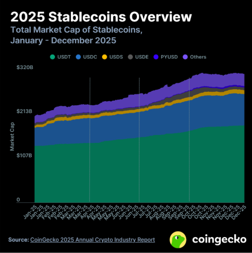 Stablecoins finished 2025 at a record scale. CoinGecko estimates total stablecoin market capitalization reached roughly $311B, up close to 50 percent year on year, even after segments of the synthetic and high-yield stablecoin complex deleveraged sharply following October’s market stress. The composition of that supply also continued to shift toward more regulated, fiat-backed models with clearer reserve disclosures and policy alignment. In other words, the market is converging toward stablecoins that look less like experiments and more like narrow digital banks or money market conduits.